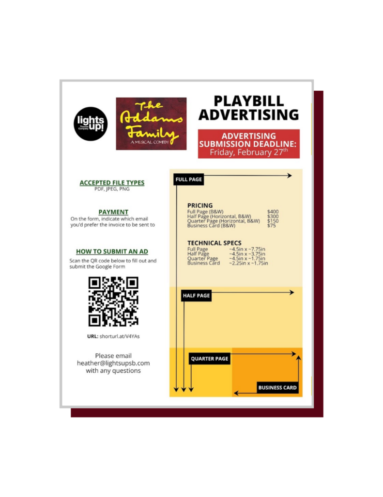 Promote your business, shine a light on your favorite nonprofit, or celebrate your Lights Up! actor with the purchase of an ad in our Playbill. We’ll even design the ad for you!