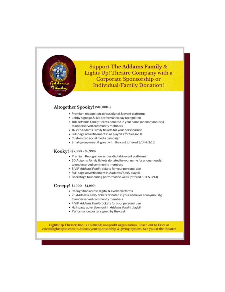Help Lights Up! bring The Addams Family to the stage with a Corporate Sponsorship or Individual/Family Donation!